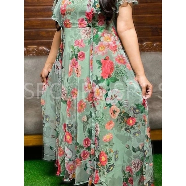 Stylish Feminine Women Gowns Fabric: Georgette Sleeve Length: Short Sleeves Pattern: Printed Multipack: 1 Sizes: M (Bust Size: 38 in, Length Size: 54 in, Waist Size: 36 in, Shoulder Size: 15 in) L (Bust Size: 40 in, Length Size: 54 in, Waist Size: 38 in, Shoulder Size: 15 in) XL (Bust Size: 42 in, Length Size: 54 in, Waist Size: 40 in, Shoulder Size: 16 in) XXL (Bust Size: 44 in, Length Size: 54 in, Waist Size: 42 in, Shoulder Size: 16 in)