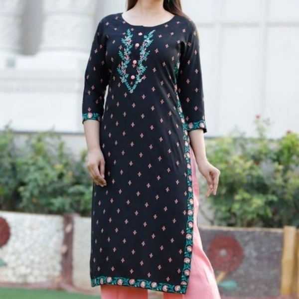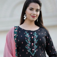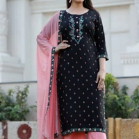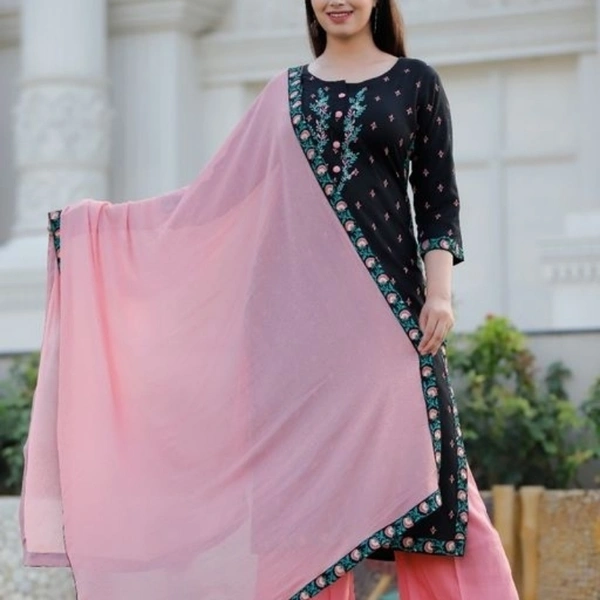 Women Rayon Slub A-line Embroidered Long Kurti With Palazzos And Dupatta